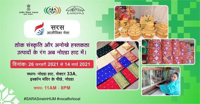 The Saras Aajeevika Mela 2021 is being organized from 26th February to 14th March 2021 by the Ministry of Rural Development. More than 300 rural self-help groups and craftsman from 27 states are participating in the Mela.